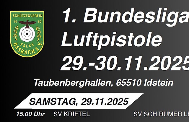 Unter dem Motto Präzision - Spannung - Leidenschaft gibt sich die Luftpistolen-Bundesliga in Idstein die Ehre. Unterstützt unsere Mannschaft aus Dasbach mental mit Dabeisein, Anfeuern und präsent sein!